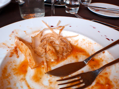 The mains arrived before long and they looked impressive. My plate of linguine had a large prawn and langoustine with some mussels and other things. I was happy. Looking around the table and waving my langoustine’s arm, I decided that I had chosen well. I began by strategically removing all the shells from the shellfish and then stripping my langoustine before digging in. It was good. The tomatoey sauce was rich and was filled with good quality tomatoes. It was just the right amount as well and before long, I was full.