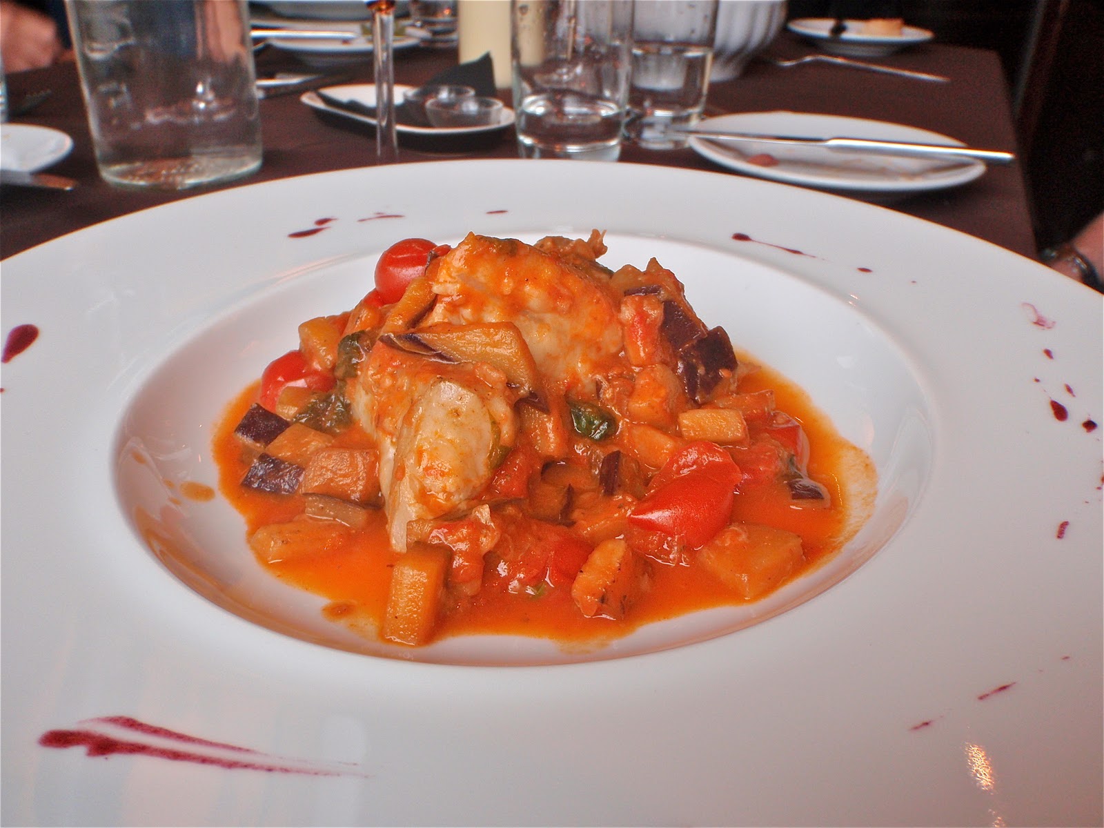 I believe that everyone enjoyed their starters, the cold meats and melon down at the far end of the table looked really impressive, but I couldn’t help but notice the waiters hovering, waiting like hawks to take away the plates. No sooner did the last fork fall did the waiter swoop in to take away the plate, asking if she was finished, as he reached for it. If she had said ‘no’, I’m not sure that he would have left it.