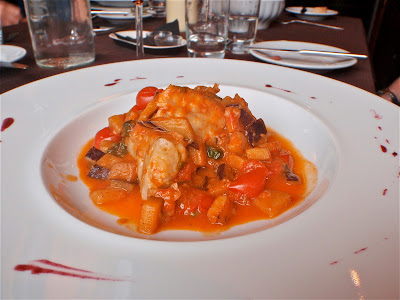 I was pleased to have opted for the skate, which was excellent. Served with aubergine and tomatoes, the fish was meaty, beautifully cooked, and plentiful. The little accompaniment of a few potatoes and concentrically circular veg was something of a curiosity, but it tasted good.